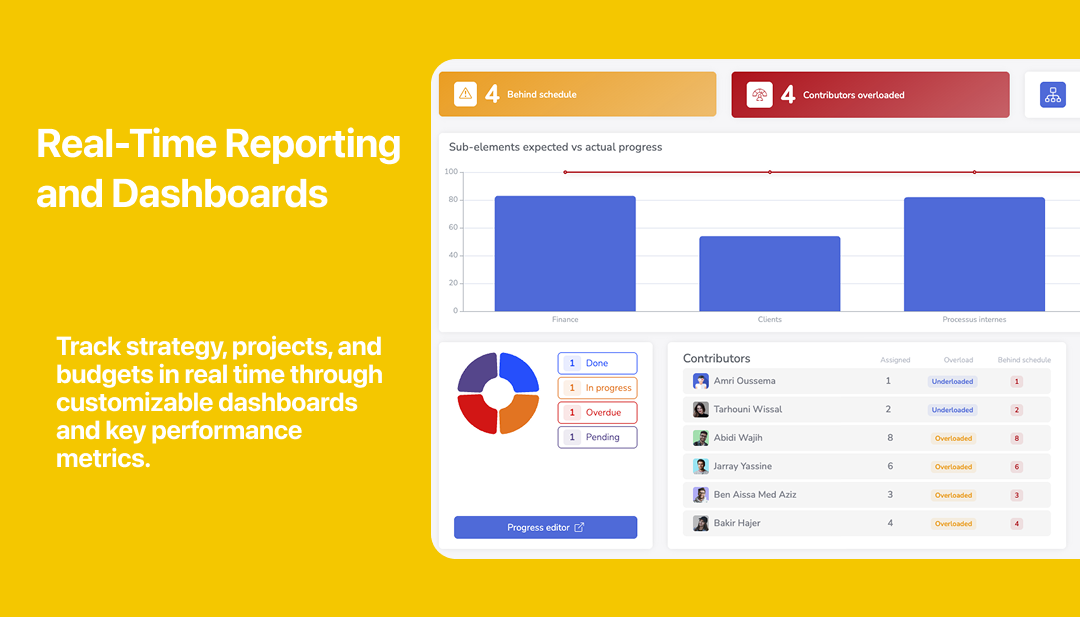 Real-time KPI monitoring directly linked to strategic objectives and initiatives. End-to-end traceability from high-level strategic KPIs to initiatives to execution progress, with automatic early deviation detection.